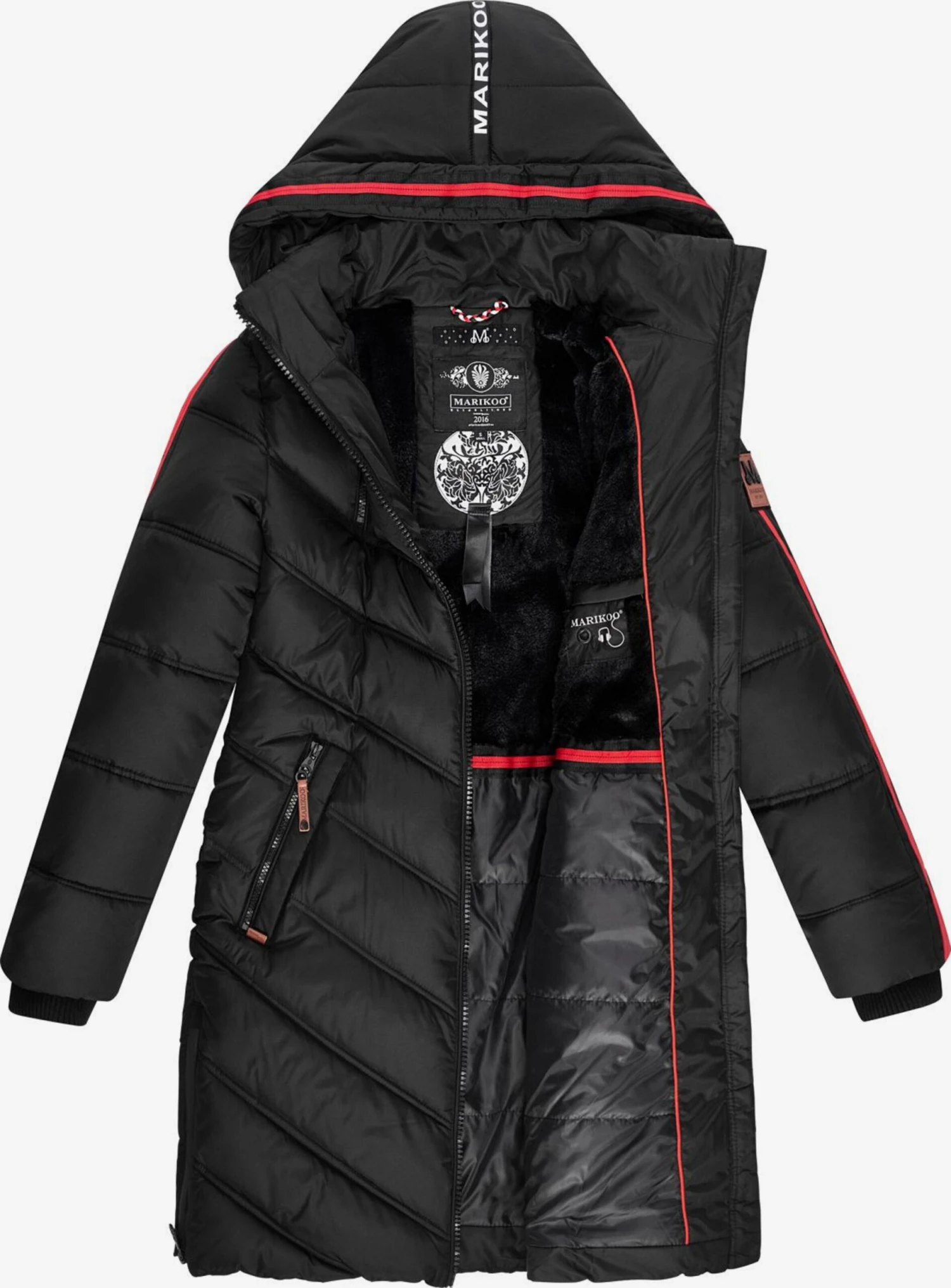 Couleur unieDoudoune matelasséeCeinture / ourlet élastiqueCapuche avec col montantCapuche avec cordon de serrageRayures latéralesCoupe cintréeFermeture éclair bidirectionnellePoche intérieurePoches latérales avec fermeture éclairDoublure en pelucheScintillantEtiquette patch / étiquette flagPiqûres de finitionsDoublure chaudeFermeture à glissière